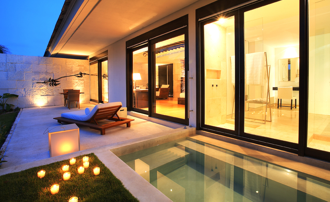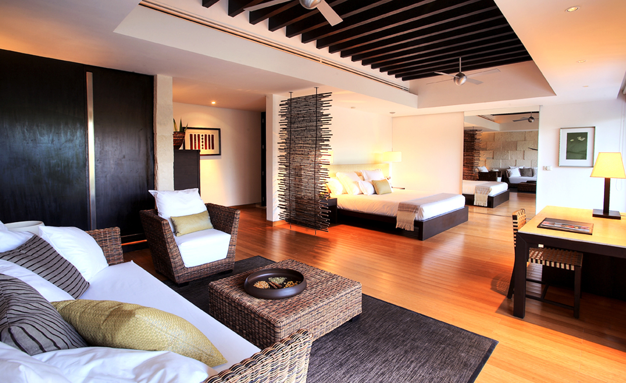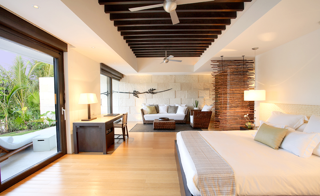Overlooking the resort’s exquisite courtyards and gardens facing the meandering river waterways, these suites invite you to soak up the sun from the comfort of your own private outdoor bathtub overlooking. Pamper yourself with the elegance of these suites featuring tastefully decorated ceilings and bamboo floors. With one king or two double size beds, these suites feature luxury leather headboards, dressers, spacious walk-in closets, floor-to-ceiling windows, separate sitting areas, oversized bathrooms and 42” HD flatscreen televisions with home theater systems. Beds feature 500-thread-count linen sheets. Bathrooms feature two rain showerheads, bathrobes and slippers. These rooms accommodate up to three guests, and connecting rooms are available.